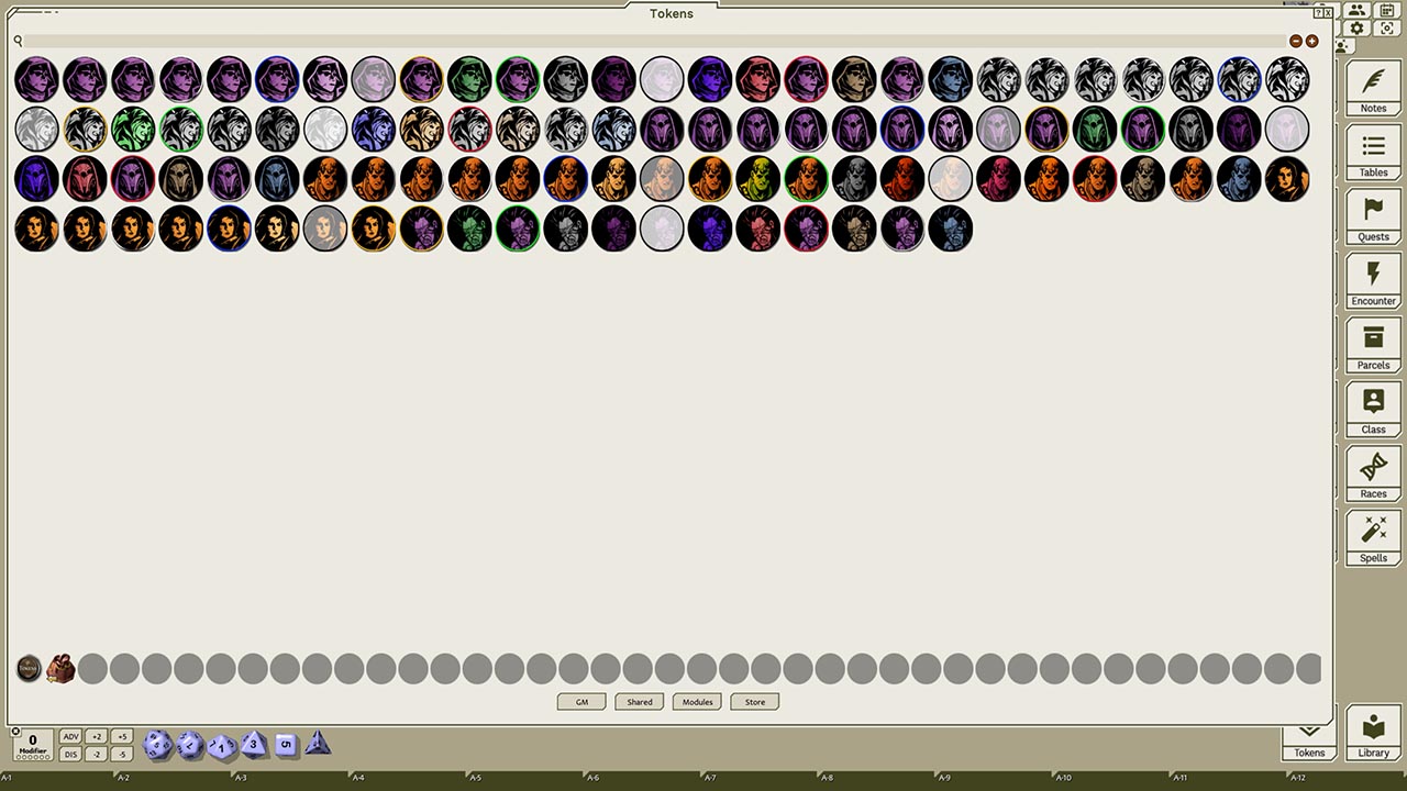 This token pack includes (ringed in black, blue, gold, green, greyscale, and silver, as well as ethereal, invisible, stone-skinned, sand-skinned, and altered state versions):