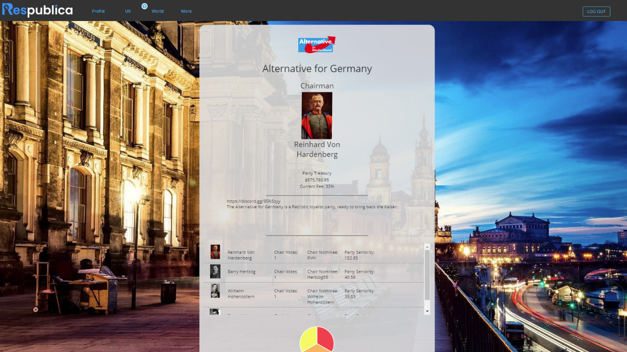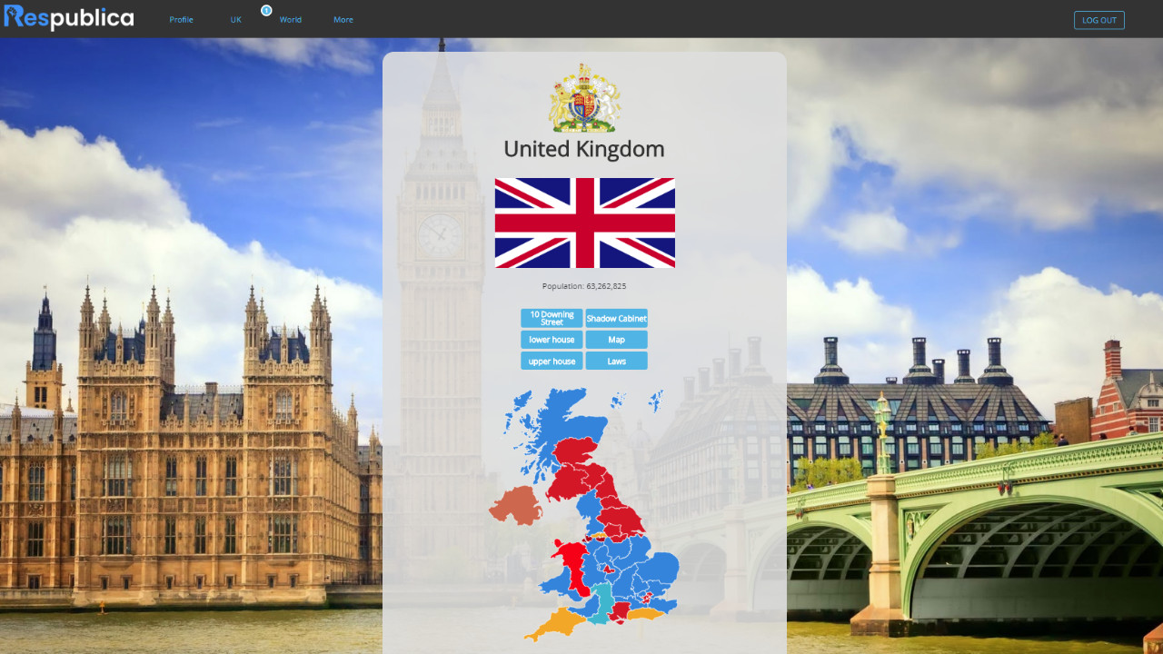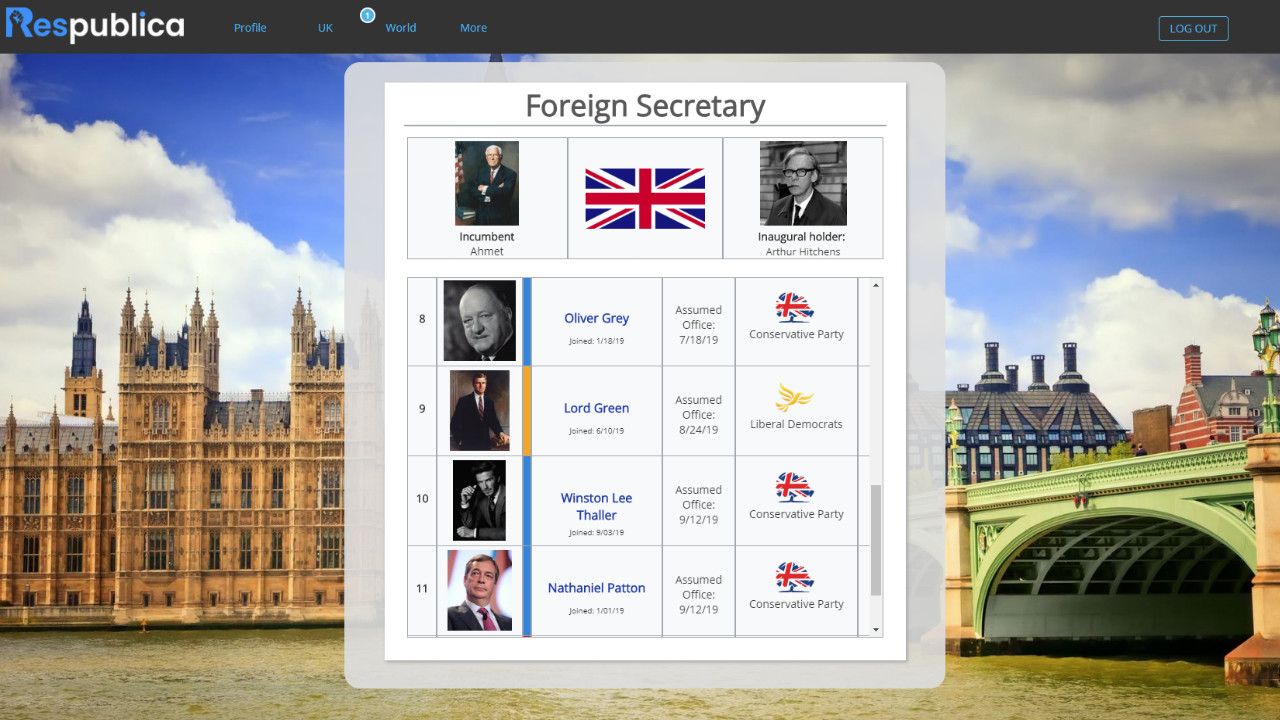 Create a politician and start your legacy. Run in national and local elections. Create and vote on legislation. Respublica is an online roleplay game, where users can run for office and control the outcome of the world within the game.