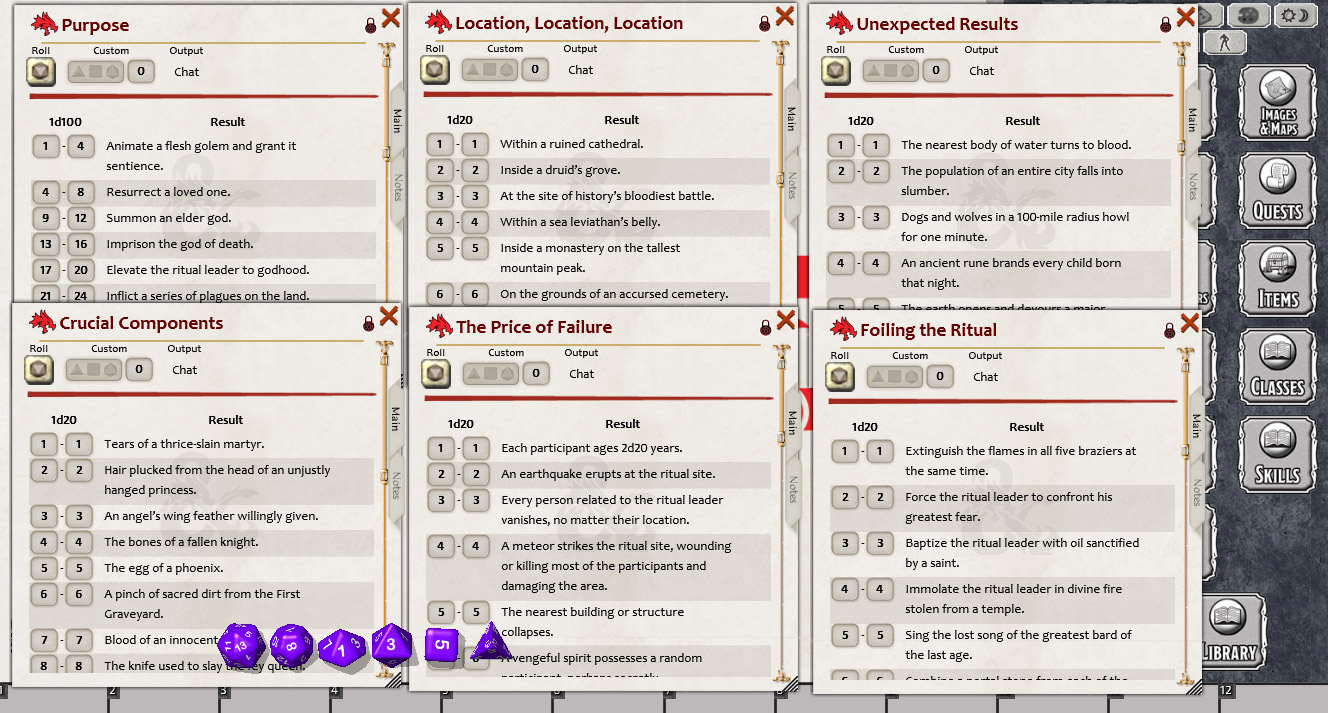Does your victim wish to inflict a plague via an obscure ritual at the start of a solar eclipse on the grounds of an accursed cemetary using the blood of an innocent demon? Build rituals to achieve your villain's dark goals. Animate a golem, summon a god, open the Gates of Hell, or banish the sun.