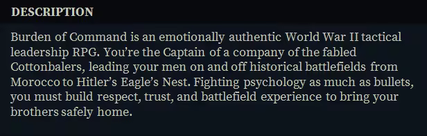 Can you lead? Burden of Command is an emotionally authentic tactical leadership RPG. You’re a company Captain in the historical Cottonbalers. Fighting psychology as much as bullets, you must build respect, trust, and battlefield experience to bring your brothers safely home.