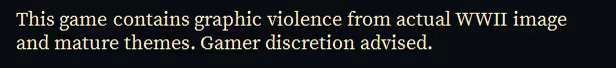 Contains infrequent historical photographs of graphic violence and disease to better illuminate the brutality of war. Not suitable for children. One section is exceptionally severe and contains sustained graphic imagery. An option is given to skip, though this is not encouraged. Mature topics such as PTSD ("Combat Fatigue") and sexual disease are covered. Language can be strong.