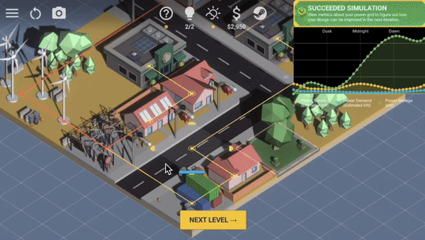 A relaxing game where you become a power engineer and iteratively design, test and build power grid designs. Balance budget and efficiency across a variety of biomes. Will you build resilient systems, or cobble something together with duct tape? It's your choice.
