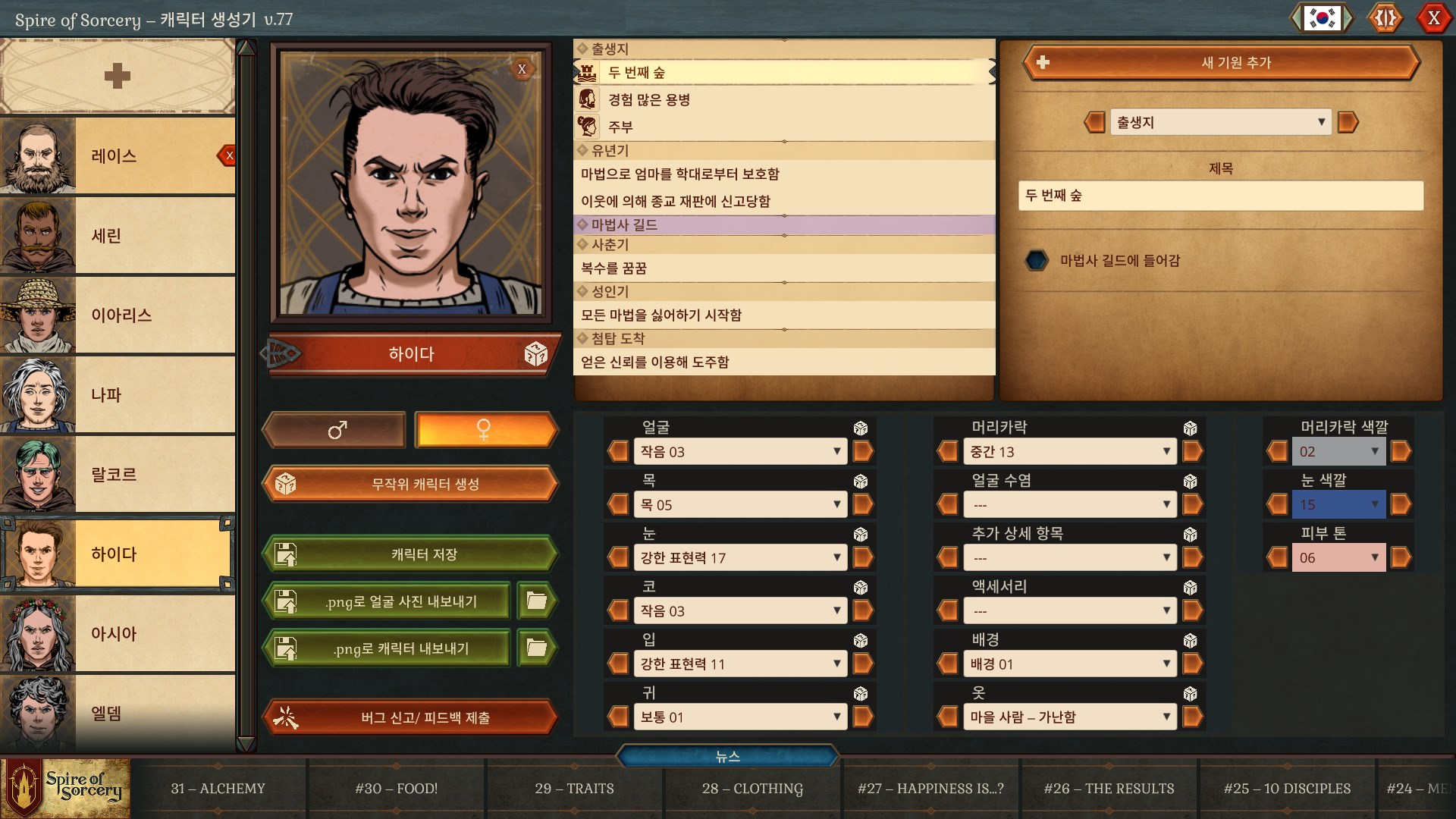 Spire of Sorcery 는 출시 예정인 오픈 월드 서바이벌 RPG이며, 제작자는 Eador. Genesis와 Gremlins, Inc.를 만든 Alexey Bokulev입니다. 게임의 이 무료 도우미 도구는 룬드 세계의 캐릭터 생성 및 수정(약력, 얼굴 사진)을 할 수 있으며 커뮤니티에 공유도 가능합니다.