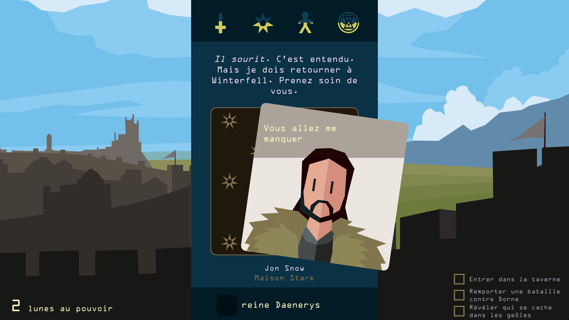 Reigns: Game of Thrones est l'héritier de la série multi-oscarisée Game of Thrones® de HBO® et de Reigns, le jeu culte développé par Nerial et Devolver Digital.