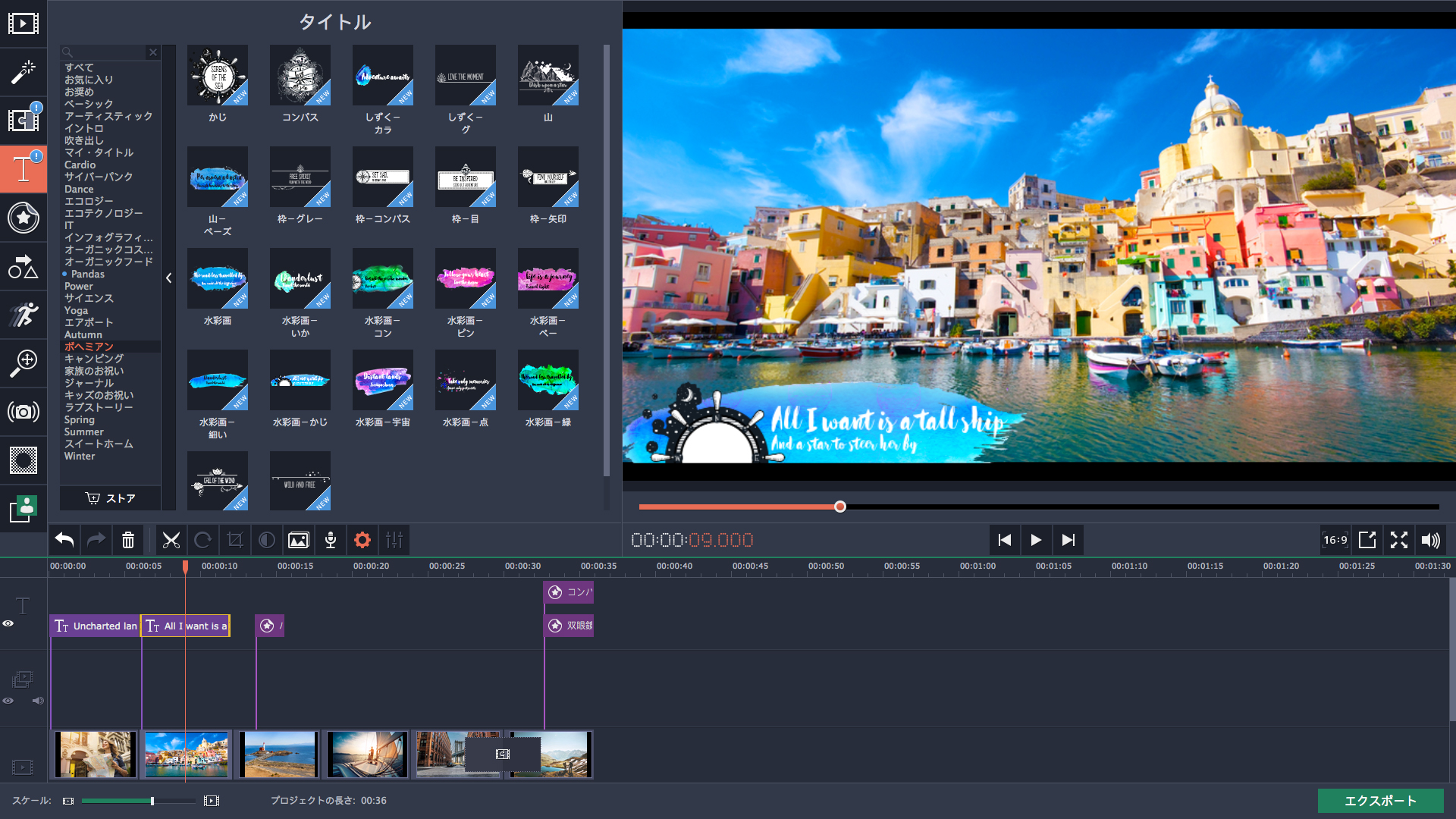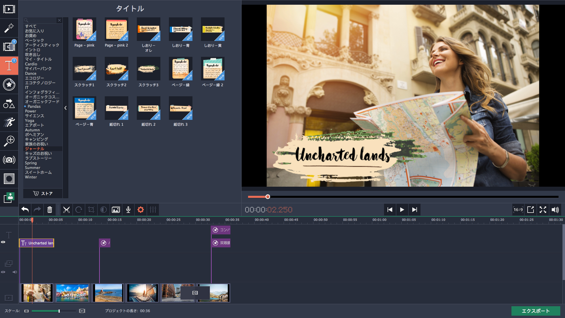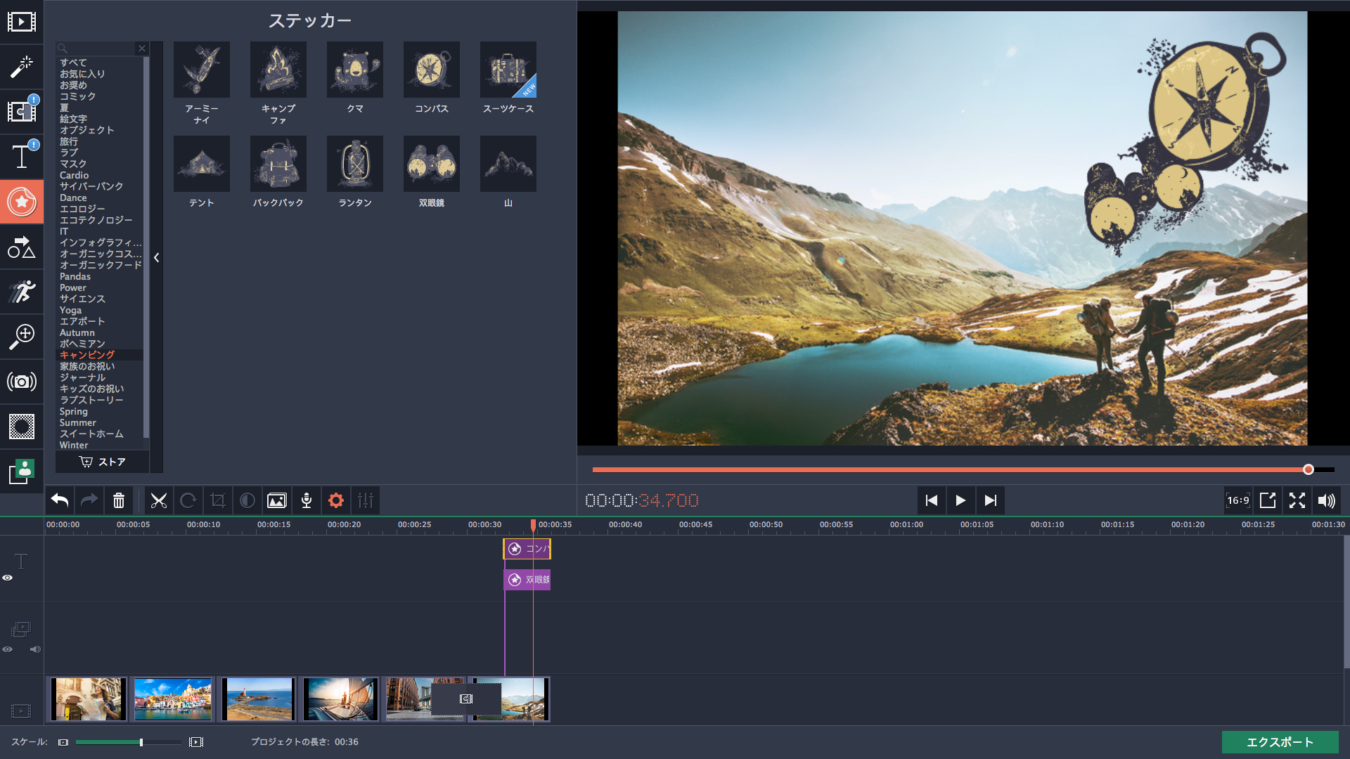 テーマ別のステッカー、タイトル、トランジション、音楽を活用して、あなたの最後の休暇の思い出を取り戻してください。