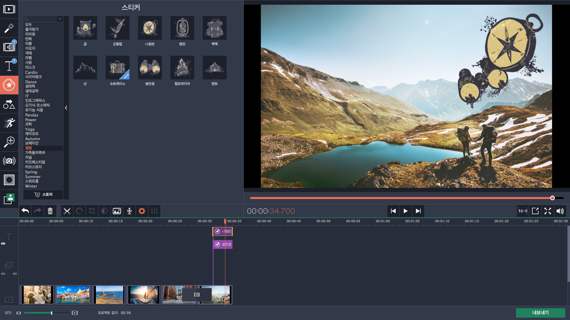 테마 스티커, 타이틀, 장면 전환 및 음악을 통해 지난 휴가의 추억을 되살리세요.