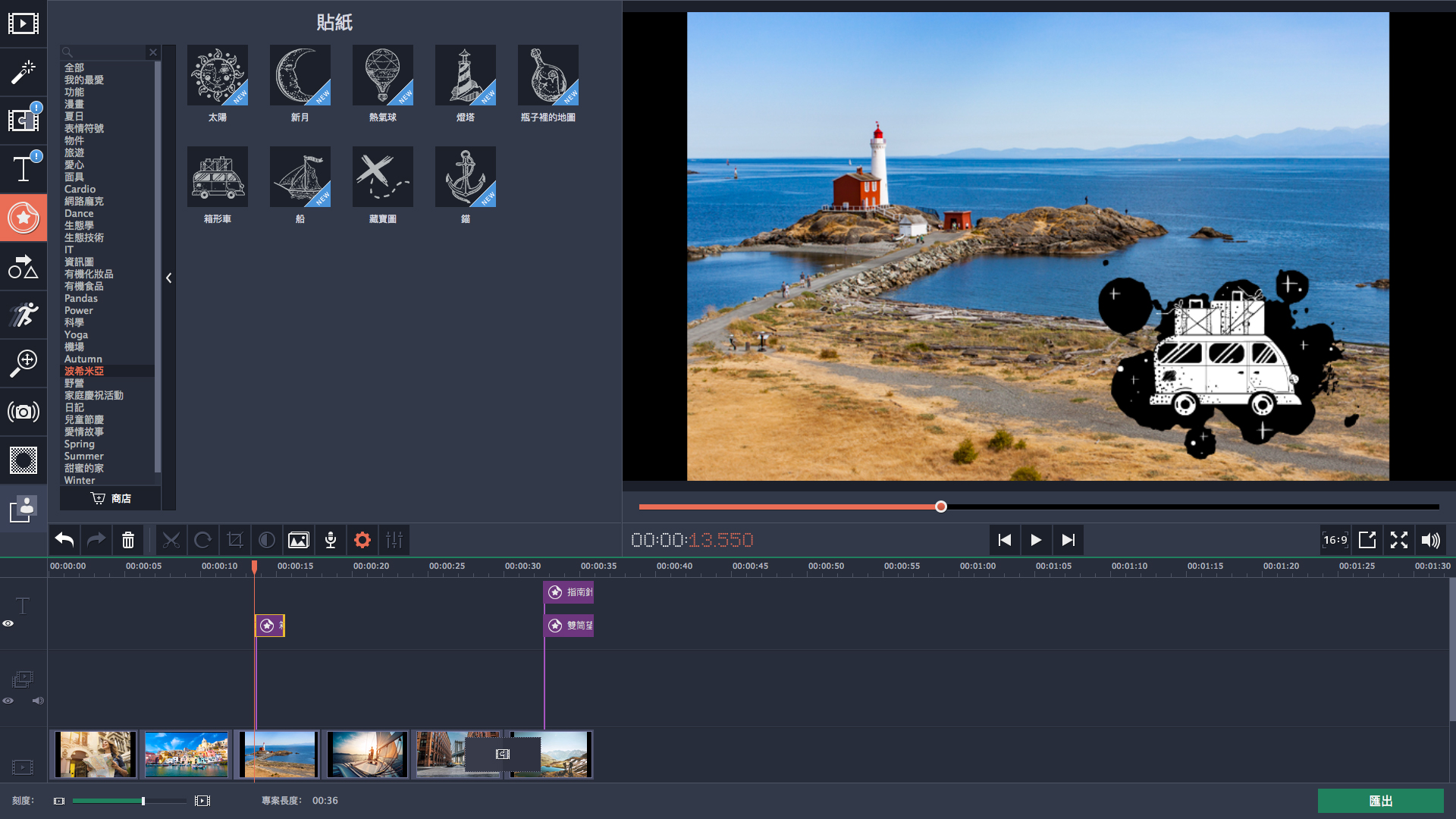 使用主題貼紙、標題、轉場和音樂,帶您重溫上回度假的美好回憶。
