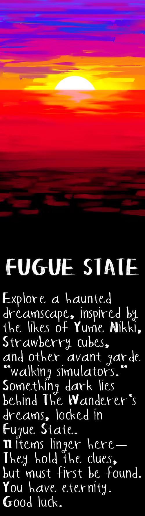 Explore a haunted dreamscape, inspired by the likes of Yume Nikki, Strawberry cubes, and other avant garde "walking simulators." Something dark lies behind The Wanderer's dreams, locked in Fugue State. 11 items hold the clues, but must first be found. You have eternity. Good luck.