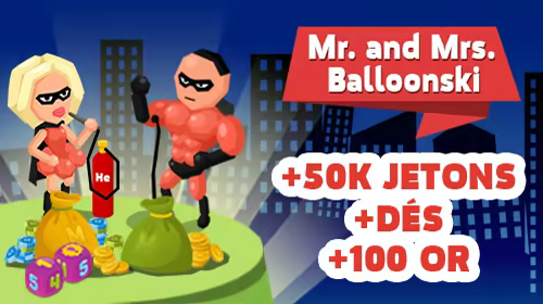 Après l'achat, seront ajoutés à votre collection les personnages et les dés "Balloonski", ainsi que 100 pièces d'or et 50 000 jetons.