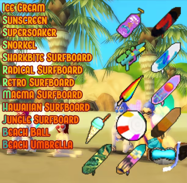 Enjoy summer in DOMO with the latest DOMO summer DLC! Featuring several permanent costumes unavailable anywhere else, eat ice cream, shoot water guns, and apply sunscreen on enemies and players alike! Enjoy surfing? There's a large variety of surfboards to collect as well! If relaxing is your style, hang out at any of the beaches with a beach umbrella and a beach ball.