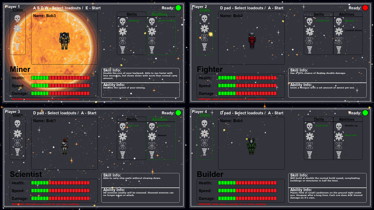 You are a team of researchers going to explore a planet for possible colonization. Unexpected storms have crashed your ship and you are now stranded on the planet's surface. Pick your class from 4, each with their own skills and abilities. Search out for parts to help repair the ship and escape this planet.