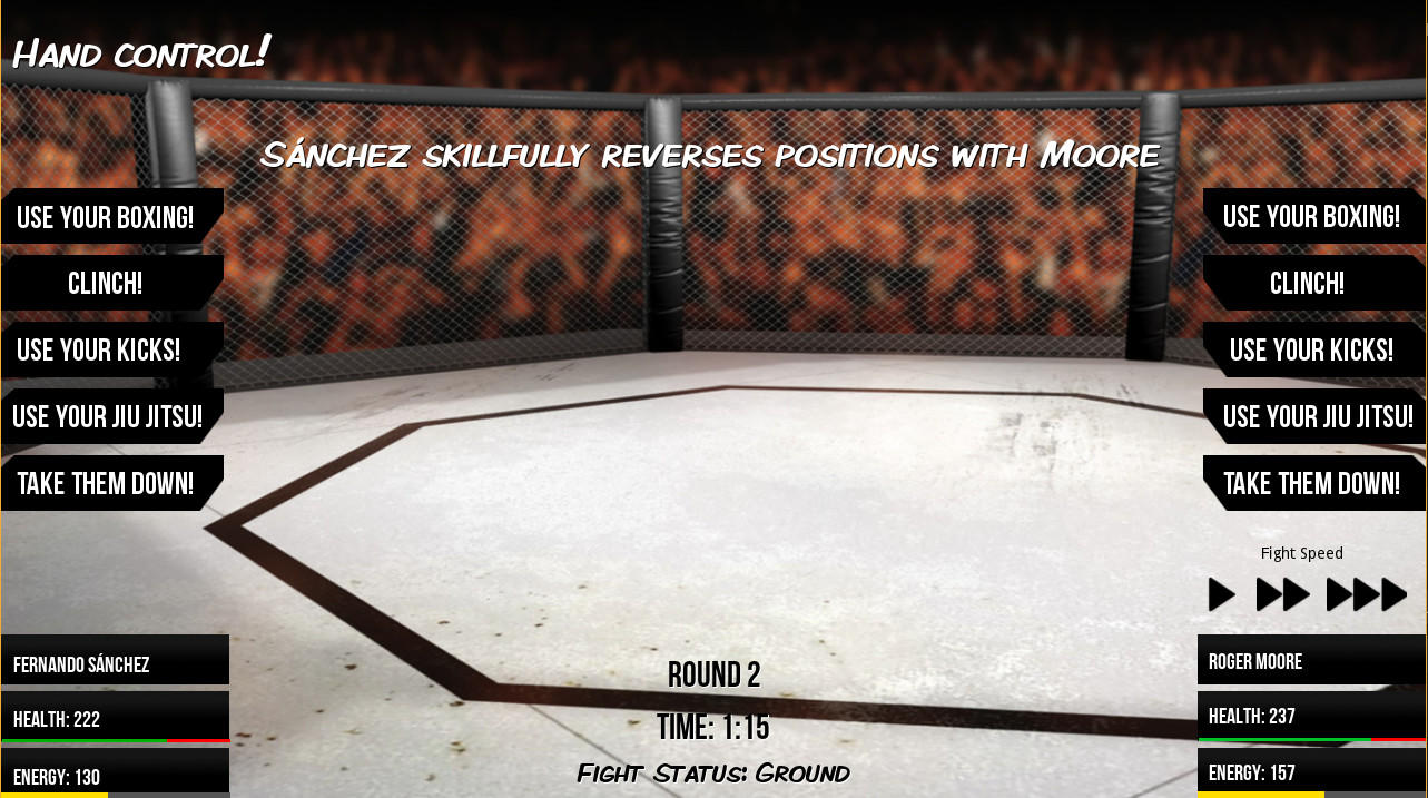 Text based, detailed combat is what MMA Simulator excels in. Fights can go anywhere a real fight does - Standing, Clinch, and Ground. Positioning matters and submissions go through several stages depending on their complexity. The dynamic is completely different between two fighters!