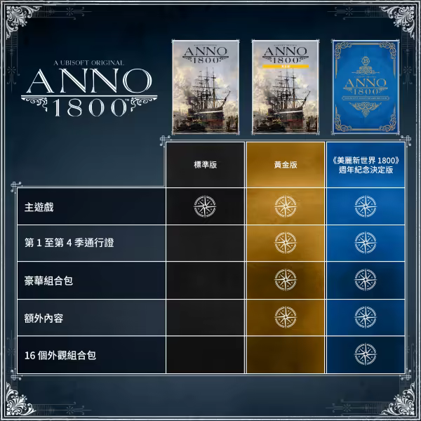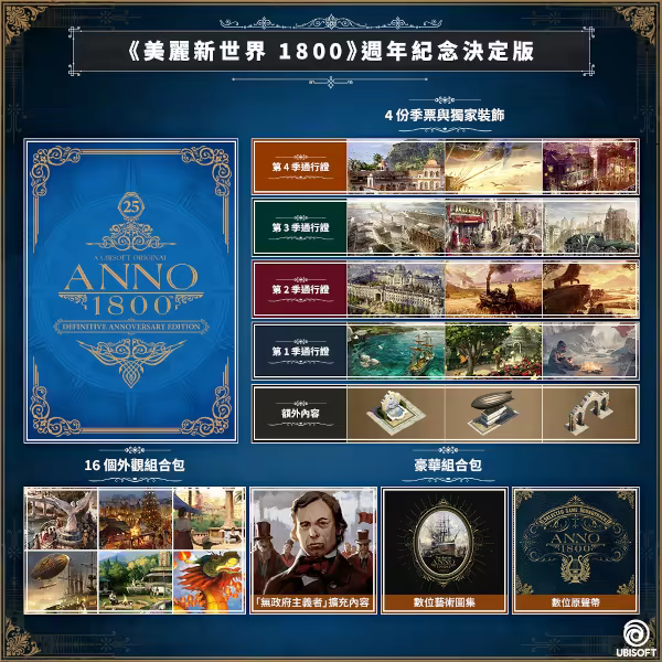 透過週年紀念決定版解鎖完整的《美麗新世界 1800》遊戲體驗,包括以下數位內容: