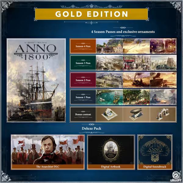 Unlock the entire Anno 1800 experience with the Gold Edition, which includes the following digital content: