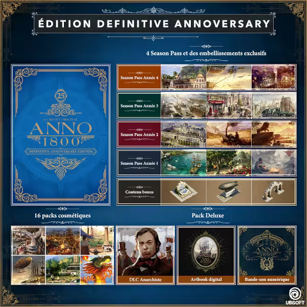Débloquez l'intégralité de l'expérience Anno 1800 avec l'édition Definitive Annoversary, qui contient le contenu dématérialisé suivant :