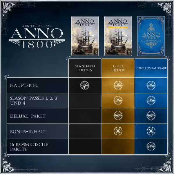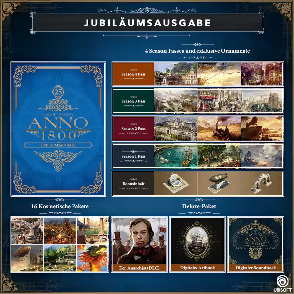 Schalte mit der Anno 1800 Jubiläumsausgabe das volle „Anno 1800“-Spielerlebnis frei. Die Edition enthält folgende digitale Inhalte: