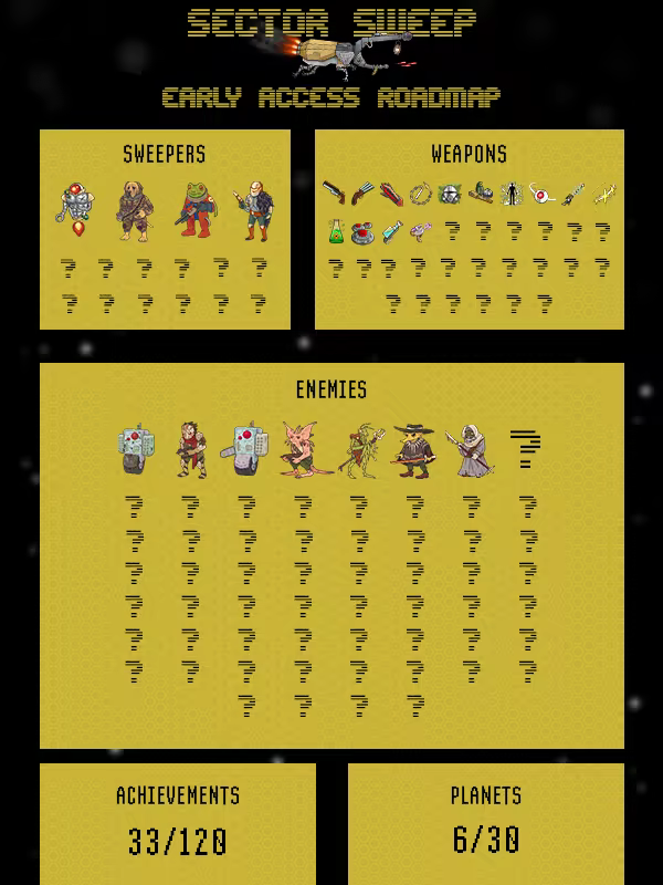Choose your character from many Sector Sweepers and clean the next planets from ever-growing enemies in this top-down action roguelike shooter. Unlock new sectors by defeating enemies and upgrading your weapons or hero powers. Be the best Sector Sweeper the company ever had!