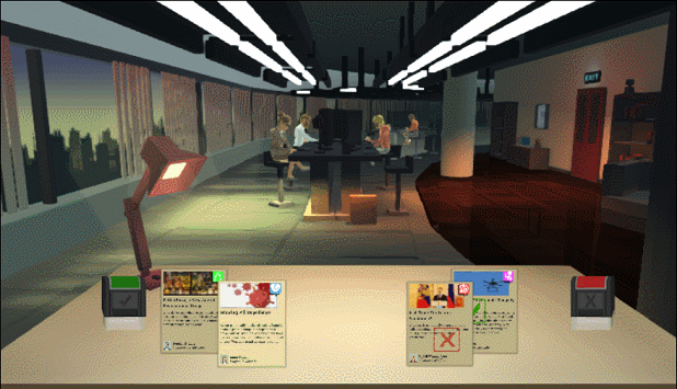 A stack of news article sits on your desk, two stampers on each side - green to approve, red to reject. Your reporting team is hacking away in the background as corporate music plays through the loudspeaker. It's time to make decisions. Will you endorse nationalized healthcare, even though your love interest is worried about increased wait times? Will you demonize the new synthetic alcoholic drink, even though your boss stressed they are an important investor? Will you support current government, as tensions grow between the neighboring country?