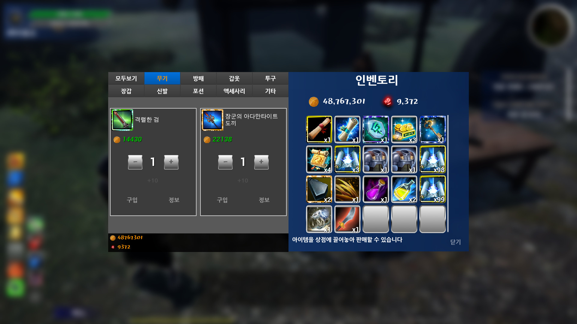 많은 아이템 종류가 있습니다. (아머, 헬멧, 장갑, 부츠, 악세사리, 무기, 방패) 추가적으로는 제작스크롤, 루비, 탈것, 펫 등이 있습니다. 이 시스템에서는 골드를 루비로 환전하여 더욱 뛰어난 아이템을 구입할 수 있습니다. 예를 들어 경험치와 골드%를 올려주는 버프스크롤을 구입할 수 있습니다. 아이템은 모두 9등급이 있습니다. (일반<레어<에픽<유니크<고대<전설<신화<디바인<알수없음)