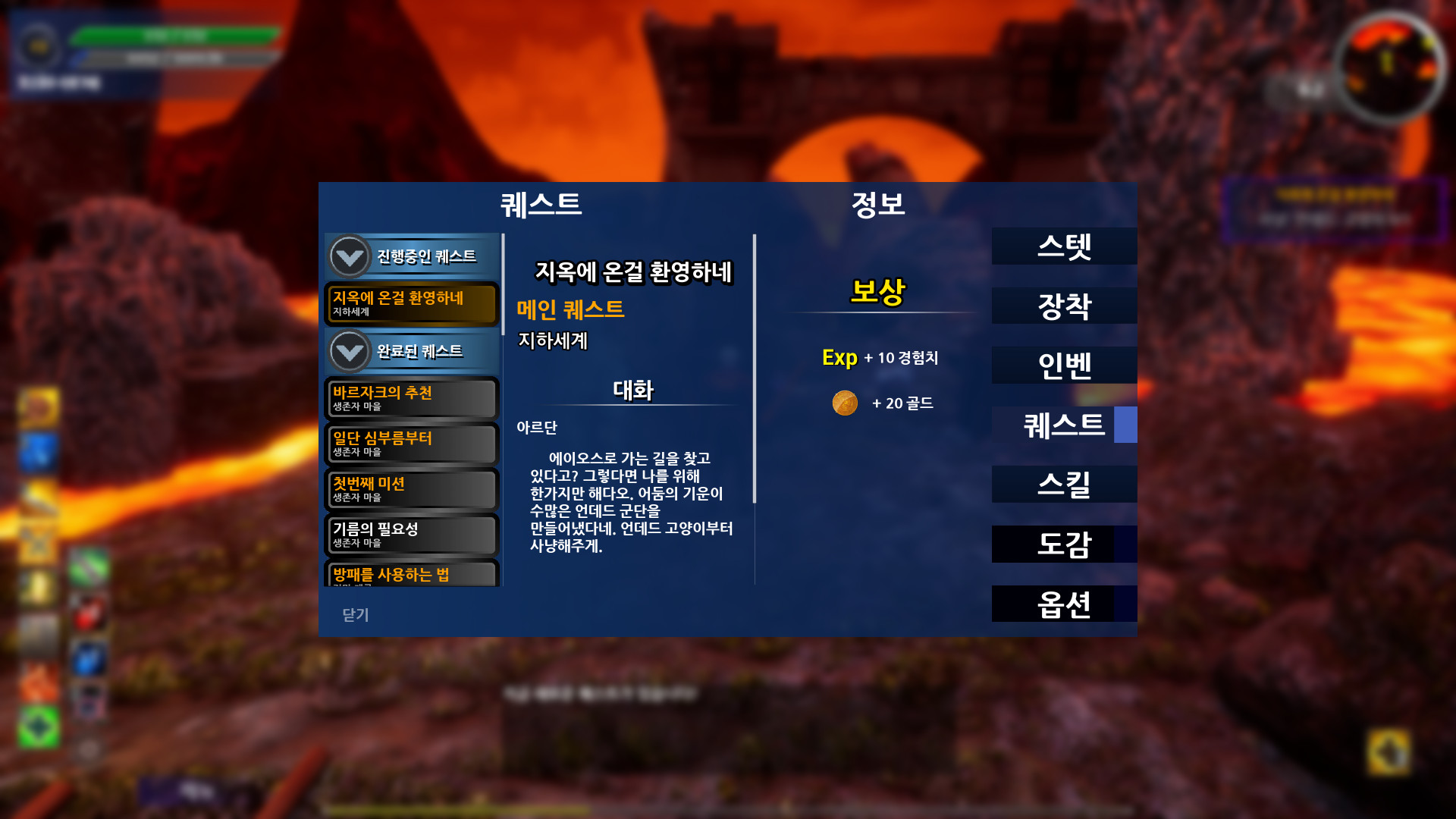 당신은 바르자크가 추천한 인물입니다. 생존자마을에서부터 시작하여 스스로를 훈련시키고, 몹들을 잡으며 판타지가 깃든 섬, 에이오스로 가게됩니다. 이 여정에 참여하면서 당신은 많은 퀘스트와 보상을 받게 될 것입니다.