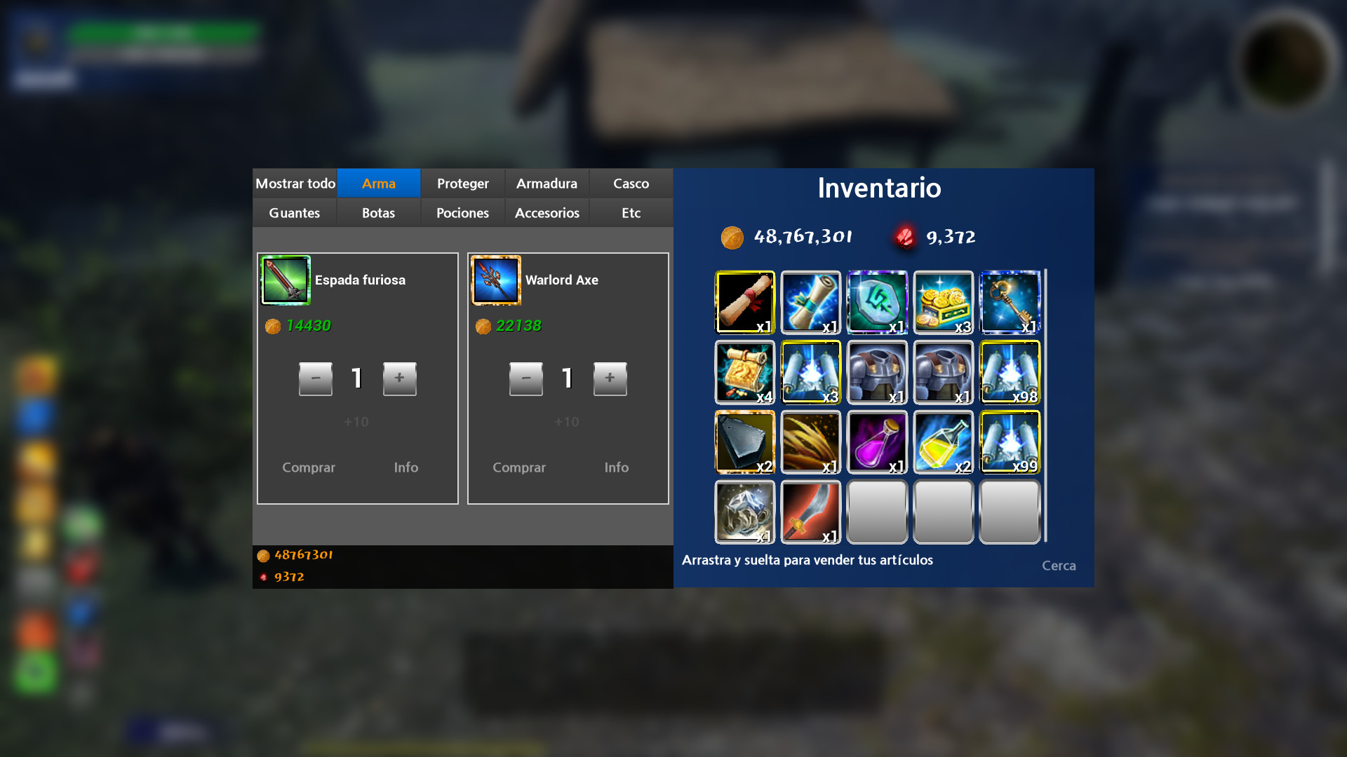 Hay muchos elementos para enumerar: armaduras, cascos, guantes, zapatos, accesorios, armas y escudos. Además, artesanías volutas, rubíes, paseos y mascotas también están disponibles. En este sistema, puedes transferir tus oros a rubíes para que puedas comprar artículos avanzados, como pergaminos buff que aumentan tu exp% o% oro. Los ítems se dividen en 9 diferentes grados: Normal <Raro <Épico <Único <Antiguo <Leyenda <Mito <Divino <Desconocido.