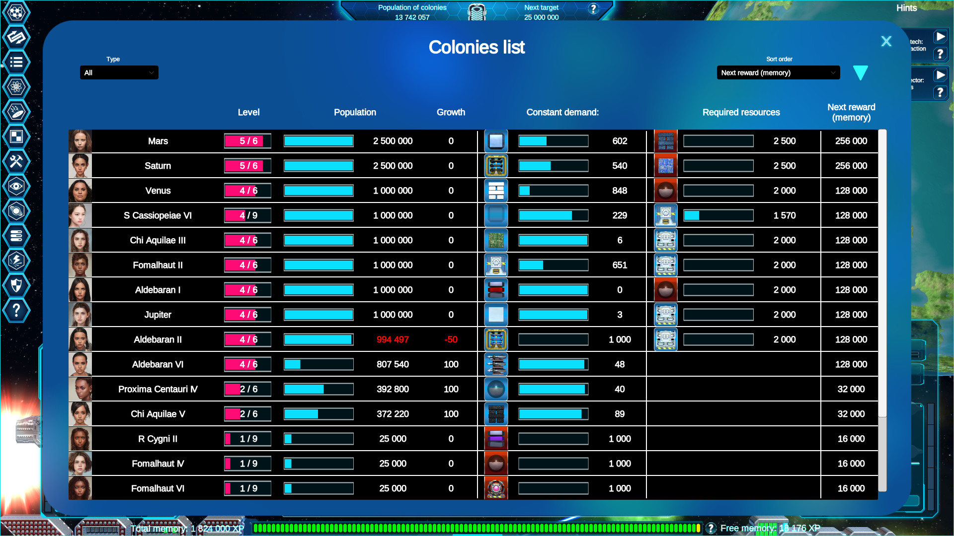 As it develops, the AI becomes able to unlock and use more and more advanced technologies (over 150). AI data placement requires memory, which is provided by colonists for certain achievements (capturing new sectors, increasing the level of planets, reaching global population marks.