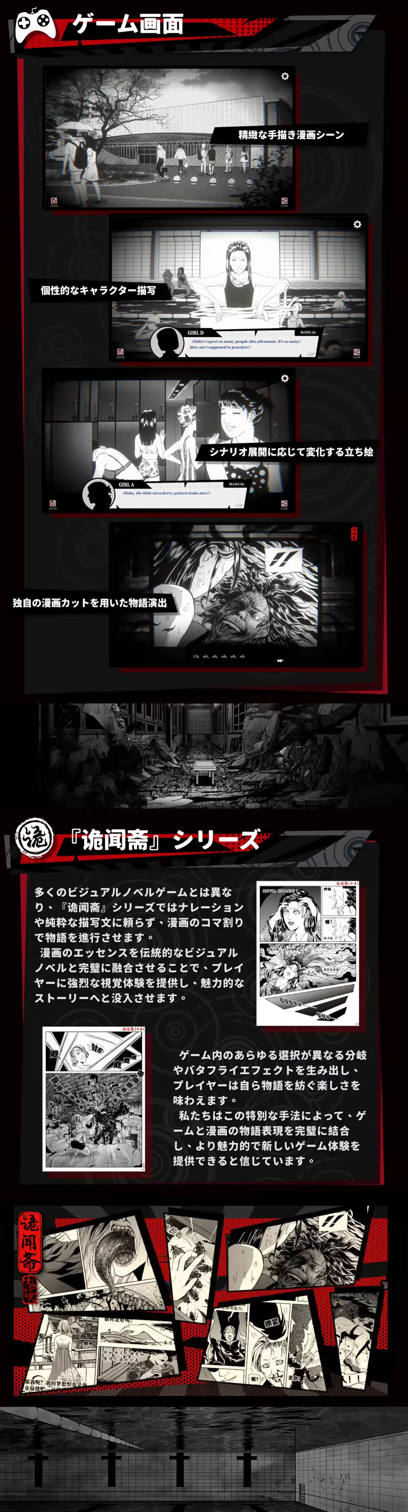 奇妙なキャンパスの伝説、日本の伝統的な白黒コミックのホラーストーリーに連れて行ってください。 おなじみのシーンを目撃し、恐ろしい瞬間を熟考してください。
