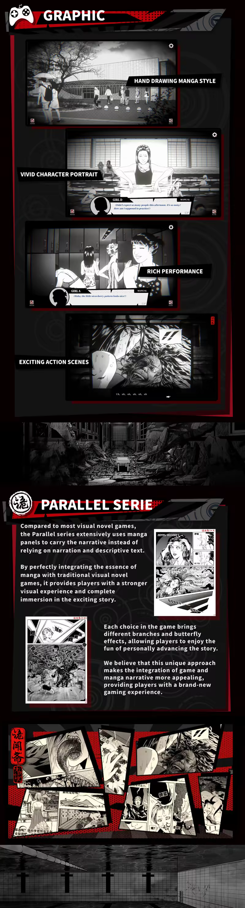 A bizarre campus legend, take you into the traditional Japanese black-and-white comic horror story. Witness the familiar scenes and contemplate the terrifying moments.