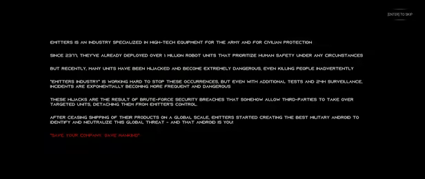 A fast-paced, first-person experience set in a future taken over by deadly hi-tech drones. As humanity's only hope, it's your mission to identify this threat's origin and neutralize it. But are you ready to face an army whose single target is yourself?