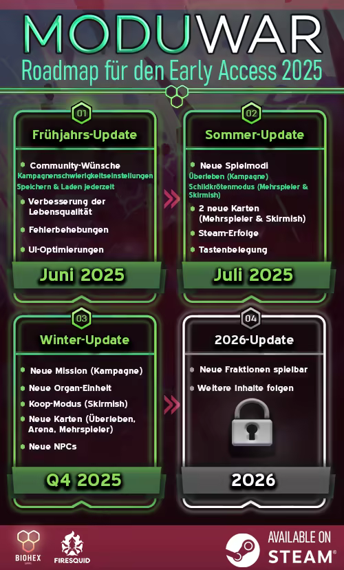 Moduwar ist ein Echtzeit-Strategiespiel, das das Genre mit seinem einzigartigen modularen Gameplay neu definiert. Anstatt herkömmliche Einheiten zu befehligen, steuerst du den Modu, eine äußerst anpassungsfähige einheimische Art von Wasserlebewesen, die in der Lage ist, ihre organischen Strukturen in Echtzeit zu vergrößern, zu verschmelzen und zu teilen. Durch die strategische Entwicklung verschiedener Organe erschaffst du maßgeschneiderte Einheiten, die sich an jedes Kampfszenario anpassen.