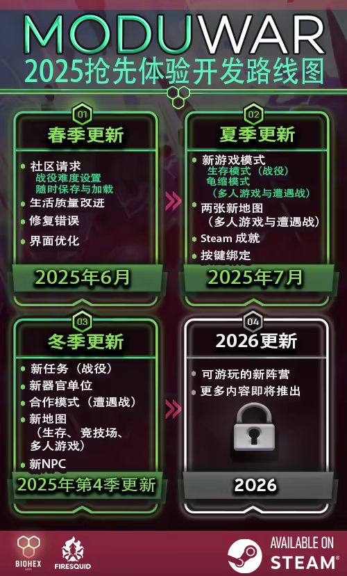 “我们将根据玩家的反馈,添加更多精彩内容,包括新增单位、完整的剧情战役模式、更多独特的 NPC 生物以及全新的游戏模式。”