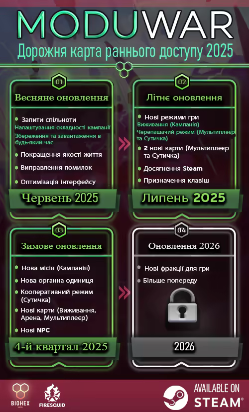 Moduwar — це органічна RTS, де ви керуєте Modu, інопланетною істотою, чиє тіло — це ваша армія. Створюйте органи, мутуйте їх в бойові одиниці й адаптуйтеся до загроз у одиночному та мультиплеєрі.