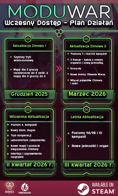 Moduwar to adaptacyjny organiczny RTS, w którym kontrolujesz obcą istotę Modu – twoją armią jest ciało. Twórz organy, dziel, łącz i mutuj je w unikalne jednostki, dostosowujące się do twoich potrzeb w walce z ludźmi i Obcymi w trybie solo i wieloosobowym.