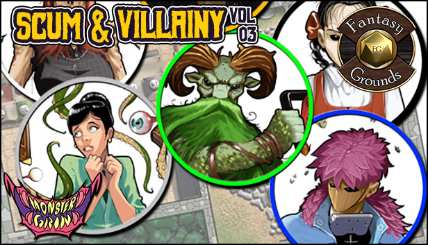Bring on the baddies! Looking to add some major bad guys or BBEG's to your online game? With these new, unique 154 tokens from Monster Grin, perfect for urban, fantasy, modern, cyberpunk, horror, or paranormal games, you can do just that. Full color, B&W, greyscale, full body and portrait style tokens, all of which are usable as PCs, NPCs, mooks, monsters, or bosses - whatever you need for your game.