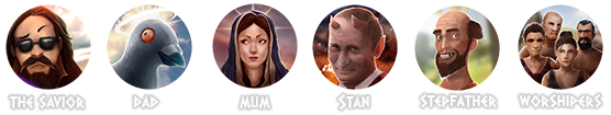 In The Savior's Gang, the player controls The Savior, a powerful entity that is crucified and trapped between the world of mortals and heaven. This unfair death triggers the wrath of his father, an almighty pidgeon, which unleashes a series of traps, disasters and dangers all over the world. The Savior must negotiate with his Father to stop these catastrophes and save only his worshippers from all these evils and, try to get out of limbo and recover his power. To achieve his goals, he will have his good friend Stan (he hates to be called Satan) and the intermediation of his Mother and Stepfather.