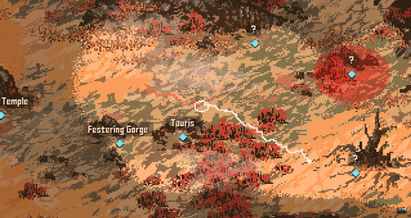 Travel through a gritty, post-apocalyptic wasteland by world map and explore hand-painted, organic locations. Meet exciting characters, talk to the Fleshkraken, visit the Puke Bar, or descend into old temples in search of expanding your awareness.