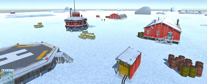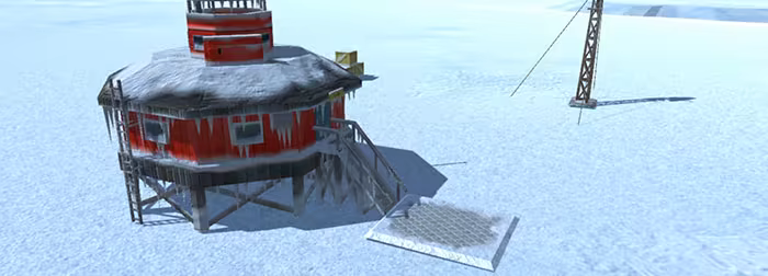 The base has a collection of buildings located near the middle of the island. There are four small huts used for observation spread around the island.