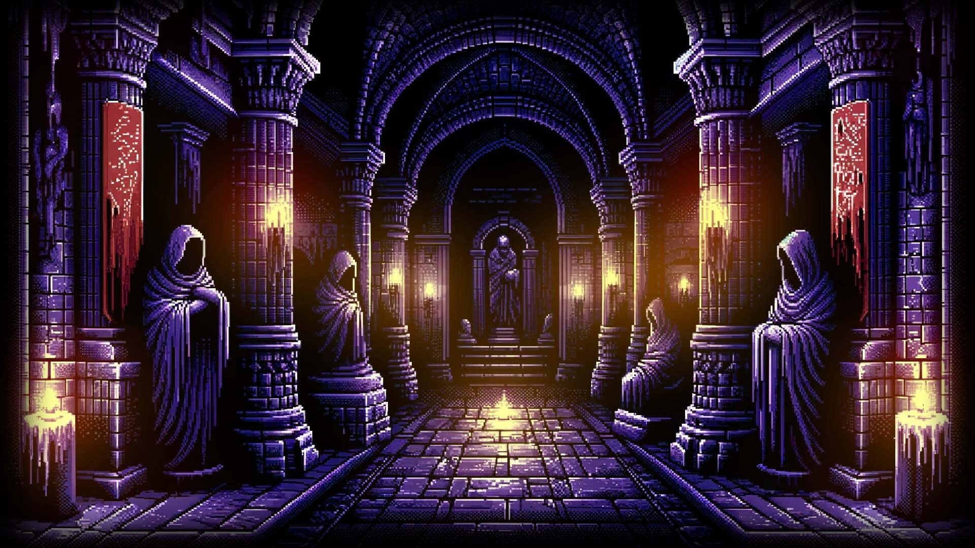 The game from the middle distance demonstrates blood and scenes of violence in battles with monsters, that's executed in pixelated style.