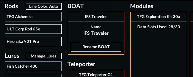 The Buoyant Object for Above-Water Travel (or BOAT) is a high-tech watercraft equipped with a Universal Lake Teleporter capable of near-instant teleportation to lakes all over the universe. Your BOAT is also equipped with underwater jets for precise maneuverability in the water, a lure fabricator that can create custom-designed lures on demand, and several module slots that allow you to customize your BOAT to your liking.