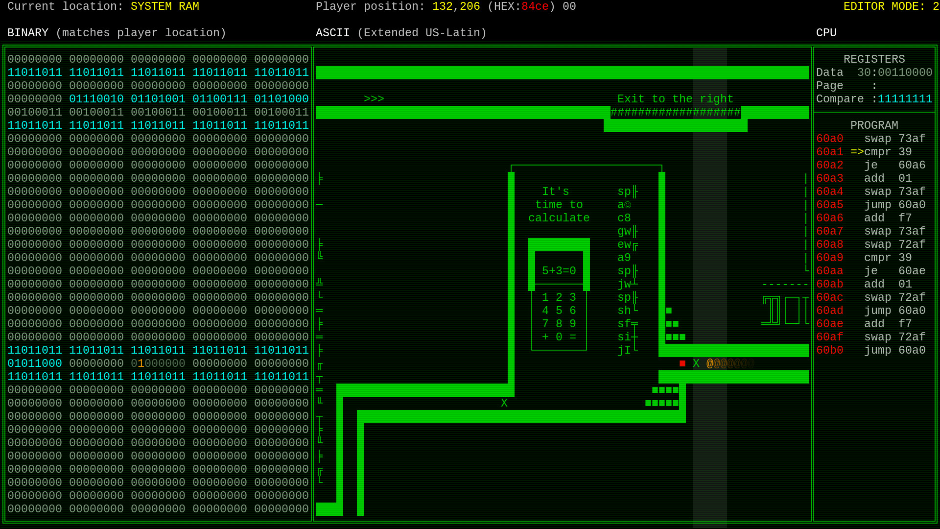 With ability to XOR into adjacent bytes, you can navigate your way through existing data in the memory. The game automatically marks the bytes you cannot go through without getting yourself overwritten and prevents you entering those. Both binary and ASCII views are available, which you can utilize to find an open path for a particular puzzle.