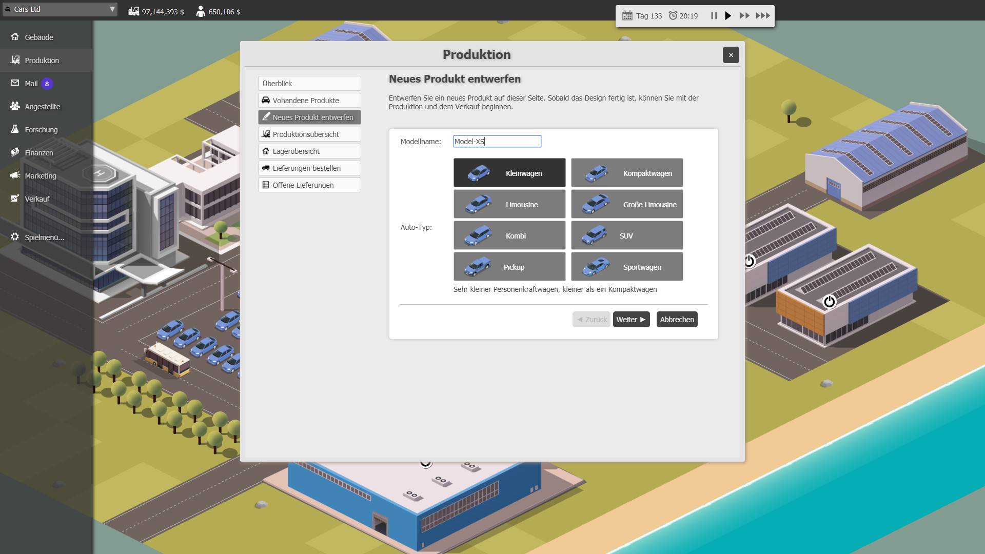 Beginnen Sie mit der Gründung einer Firma: Wählen Sie zunächst aus, was produziert werden soll. Sie können beispielsweise Autos entwerfen (Verbrennungsmotor, Elektroauto, Hybridfahrzeug) und anschließend produzieren, vermarkten und verkaufen. Andere Arten von Produkten sind Lastwagen, Telefone, Computer, Schiffe, Flugzeuge, Panzer und sogar Raketen. Wenn Sie erfolgreich sind, können Sie sogar mehr Unternehmen gründen und gleichzeitig betreiben.