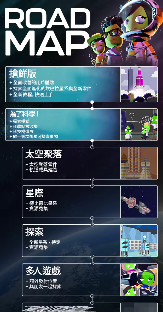 「《坎巴拉太空計畫2》會持續搶先體驗階段,直到遊戲及其全部功能達到我們所共同期盼的目標水準。從我們所列的開發進度中,您可了解我們預計發布的功能,並請關注我們的社交管道,以掌握更新時間的更多資訊。」