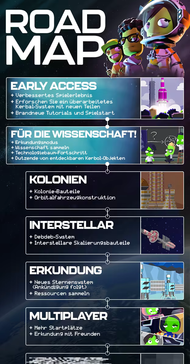Im Verlauf der Spielupdates erhalten die Spieler Zugriff auf einen kompletten Satz Werkzeuge und Technologie der nächsten Generation, darunter neue Triebwerke, Teile, Treibstoffe und noch viel mehr. Diese neue Technologie bietet Spielern nicht nur neue Rätsel zum Lösen, sondern ermöglicht im bekannten Kerbal-System und darüber hinaus auch neue Höchstleistungen der Raumforschung.