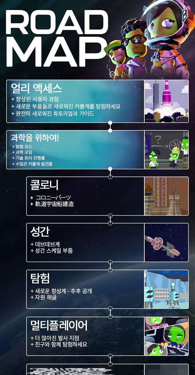 오리지널 게임 출시에 대한 오마주로 얼리 액세스로 출시된 KSP 2는 플레이어가 새로운 기능이 구축되어 가는 과정을 보면서 피드백을 제공함으로써 더욱 흥미진진한 게임을 만들어가는 과정에 함께할 수 있도록 합니다. 새로운 기능들은 얼리 액세스를 통해 주기적으로 추가되어 베테랑과 복귀 플레이어들의 환호를 불러일으킬 뿐 아니라 새로운 커보넛들이 이미 수백만 유저를 사로잡은 기발한 코믹 세계로 입문하는 데에도 크게 이바지할 것입니다.