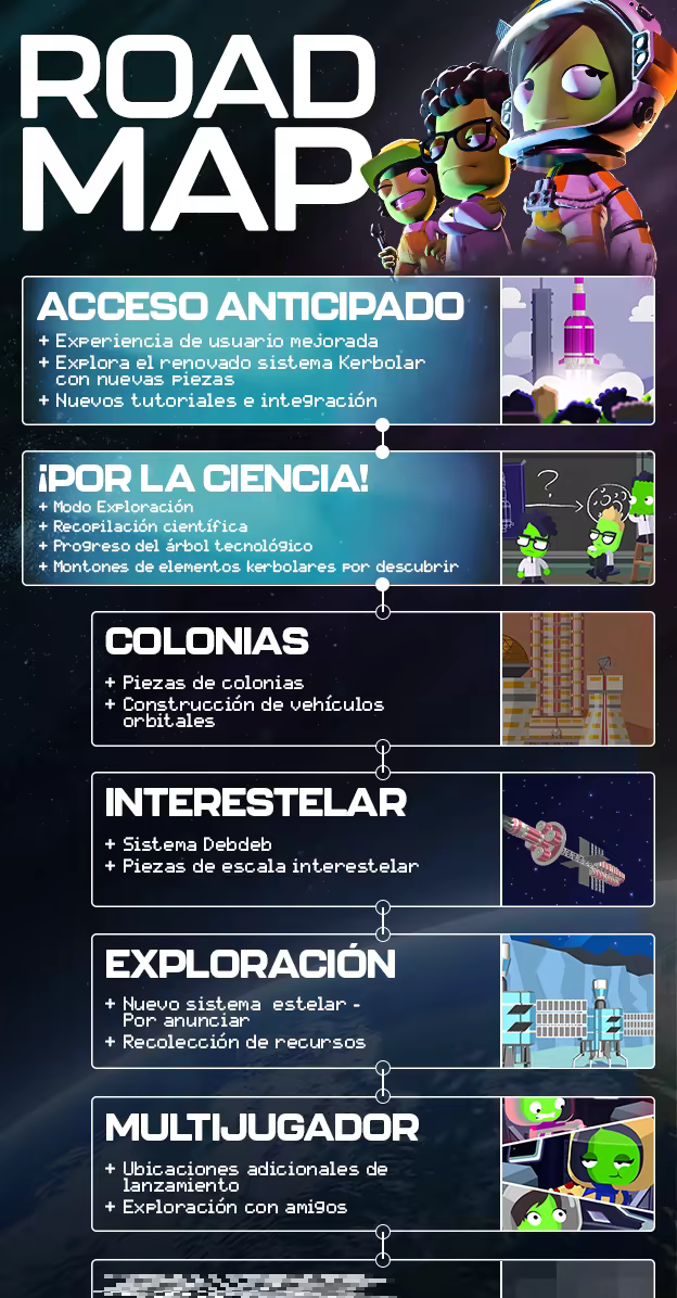 «La versión 1.0 de KSP 2 incluirá bastantes más funciones que la versión del acceso anticipado; no solo las que veréis en la hoja de ruta, sino también otras tantas que añadiremos con el tiempo. Esto incluye: