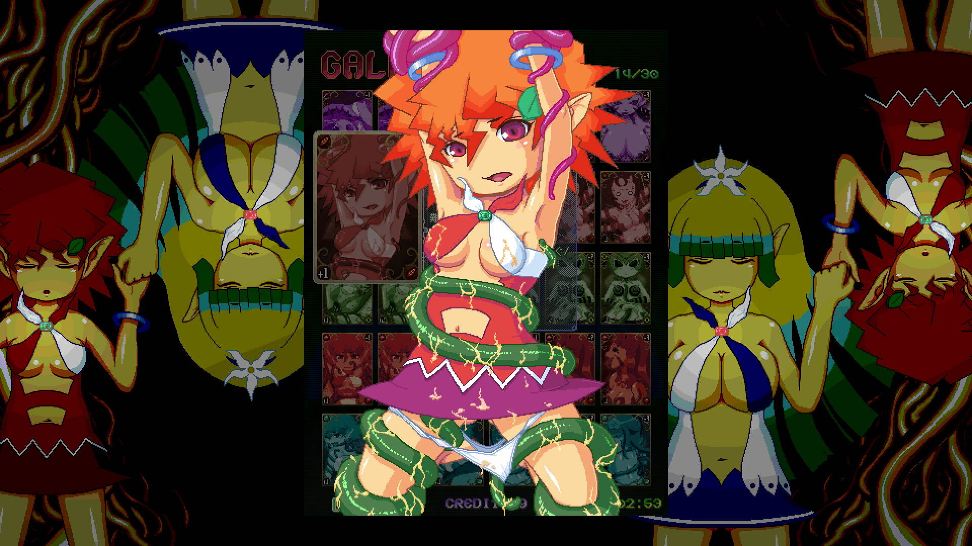 Collect cards to unlock sexy hentai CG scenes involving Kei, tentacles, and monster girl bosses at the in-game art gallery!
