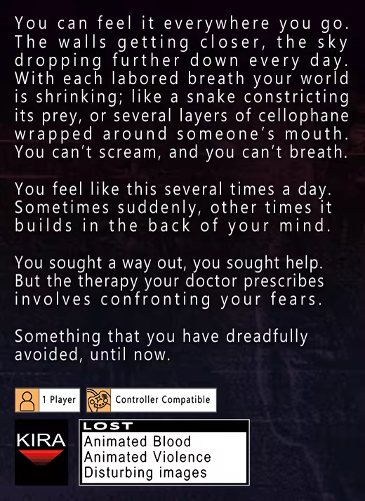A horror game about claustrophobia. During a storm your service dog is forced down a broken sewer drain. You find the nearest sewer entrance and run in after it. Along the way you will meet others that are also stricken by abnormal or psychological fear.
