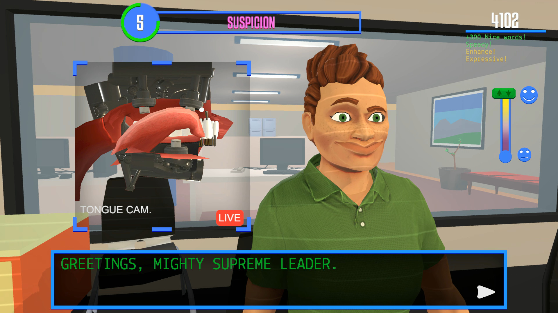 As you upgrade your social mechanics, you will have to learn to smile when something is happy and frown when something is sad. There is also the eye contact upgrade, as humans find it suspicious if you look unceasingly into their eyes with a wide smile as they tell you a tragic story.