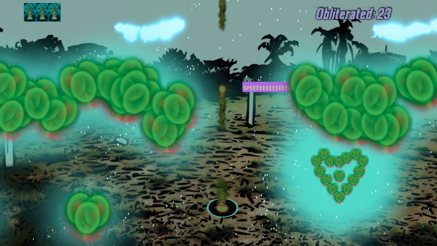 Play a shooter 2D, using a spray to explode waves of radiactive insects.