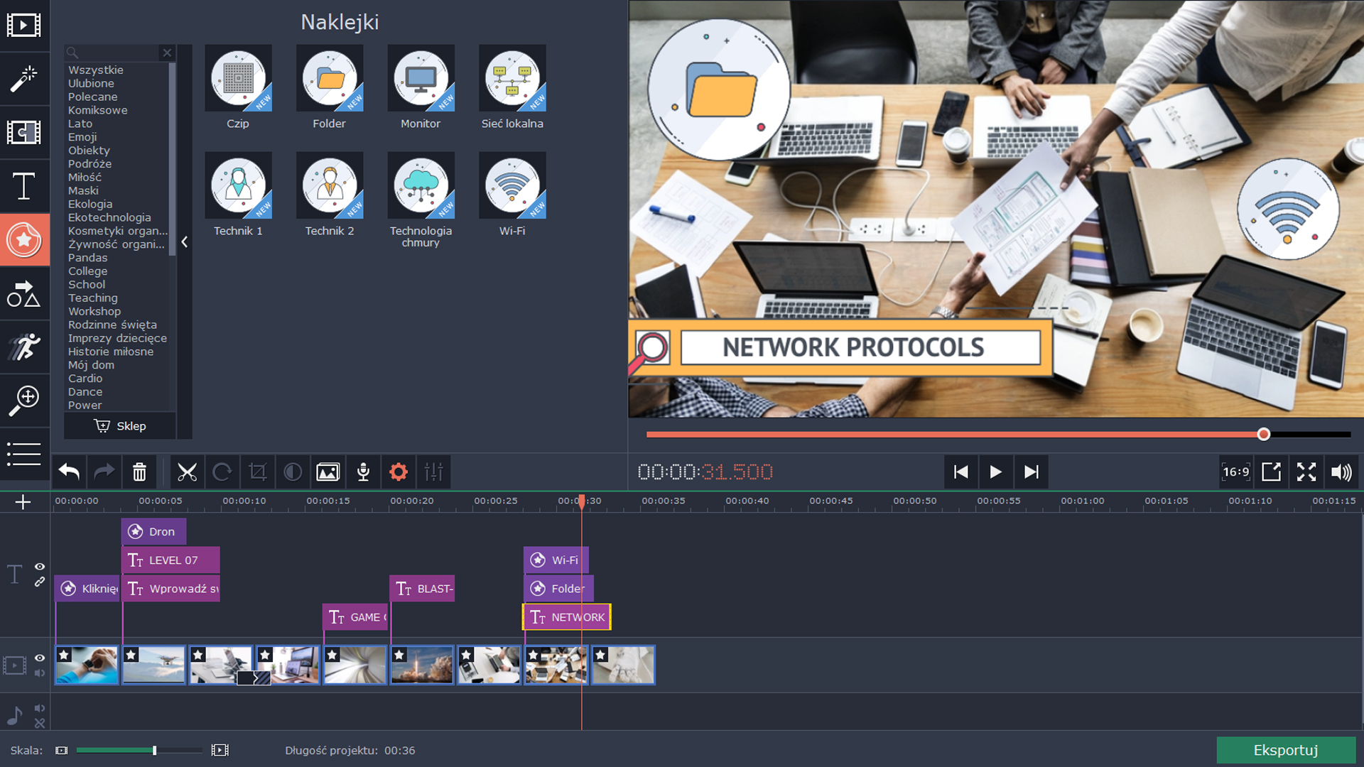 Twórz wideo z najnowszymi trendami technologicznymi lub historią nauki z wykorzystaniem pasujących napisów i przejść. Twórz jeszcze ciekawsze filmiki Zrób to sam z pomocą naklejek i etykiet.